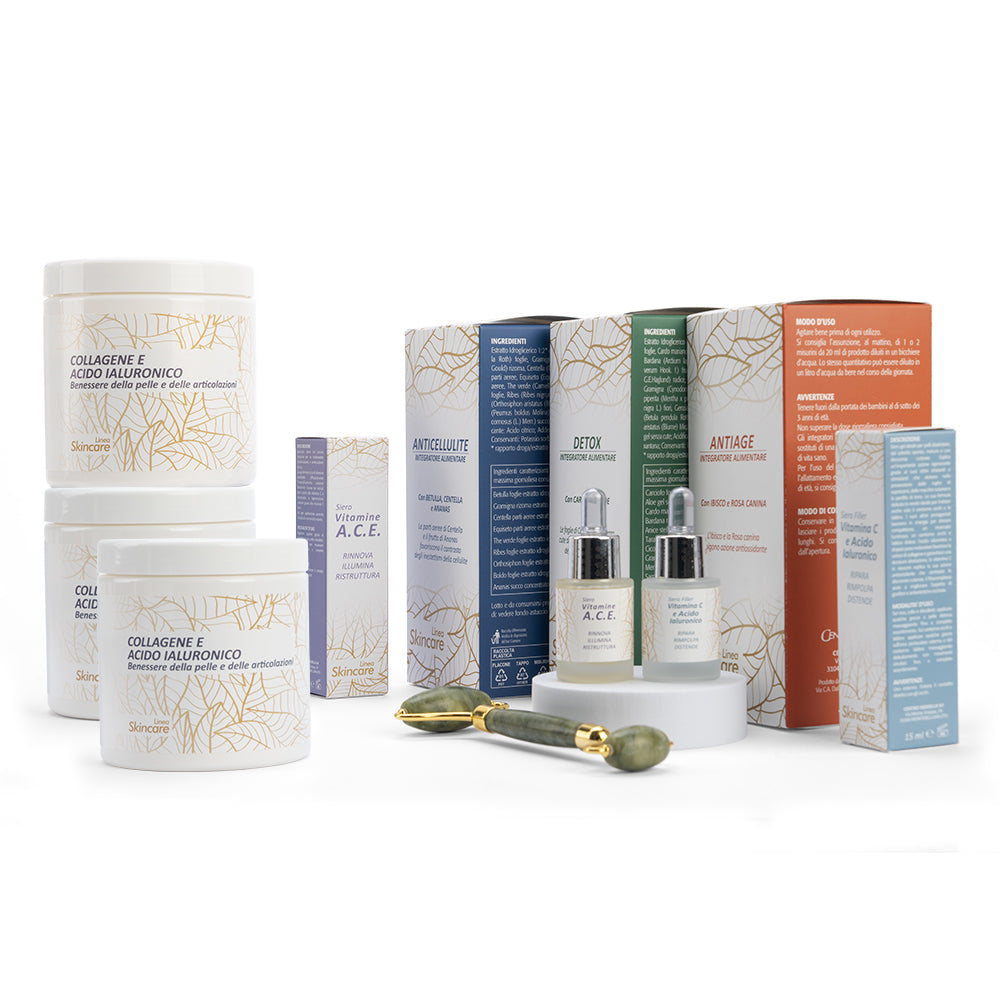 Il siero all’acido ialuronico e vitamina C applicalo nel viso la mattina dopo la detersione abituale e prima della tua crema giorno. Il siero viso alle vitamine ACE invece lo utilizzerai la sera dopo la tua detersione abituale e prima della tua crema notte. L’assunzione del collagene da bere la consigliamo la sera prima di coricarti: metti un misurino di prodotto in un bicchiere d’acqua oppure in una bevanda calda tipo camomilla, orzo o nella tua preferita, e bevi il prodotto subito.